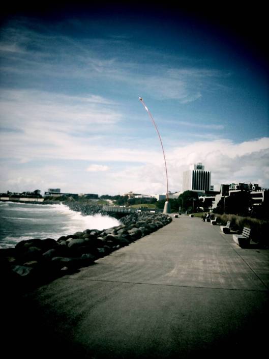 One from the archives today. Taken on my visit down to New Plymouth on the lower west coast of the North Island, I came across ‘The Wind Wand’ along the waterfront. Going by the massive coastal wave wall and the fairly strong breeze, the wand was really in its element bending and swaying to and fro. Designed by a New Zealand artist, Len Lye, Weighing 900KG and standing 45 meters high – this thing can bend in the wind at least 20 meters!