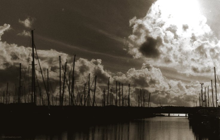 That being said, I did get a number of images I liked the feel of, today’s image ‘Black and White Sky’ being one of them. After scanning I used Gimp to slightly straighten, crop and then bumped the contrast a little and added the slight sepia tone. Taken without any filters, I do like the boat masts reaching up to a dramatic sky and the ball of sun at the top.