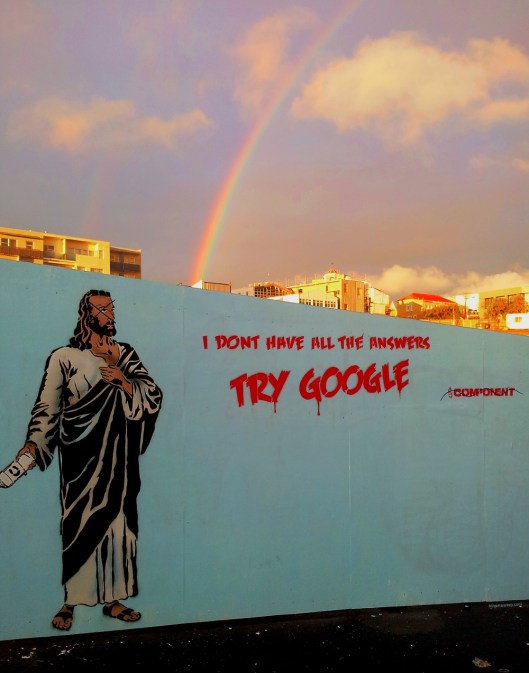 Some more street art combined with ‘nature art’ today. Walking through town after work I narrowly missed a downpour of rain and went looking for some more interesting street art. Just as I came across this interesting ‘I don’t have all the answers’ artwork a rainbow appeared! I thought it made a pretty funny combination and play on themes with Mr J looking up at the sky and a rainbow leading the way up.