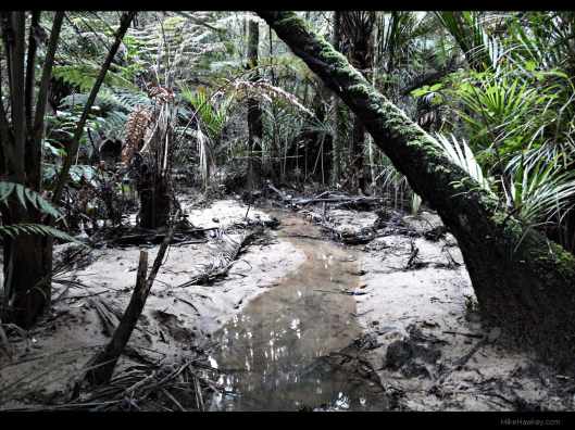 Mud aside, Eskdale Bush is a wonderful walk with numerous tracks one can turn into. Surrounded by the suburbs, there is no real risk of being badly lost. Just as I hit one of the lower and deeper parts of the bush I came across a small, possibly newly formed, stream. With the Ricoh set to 800iso I positioned as low and stable as the slippery surrounding would allow and followed the stream into the forest.