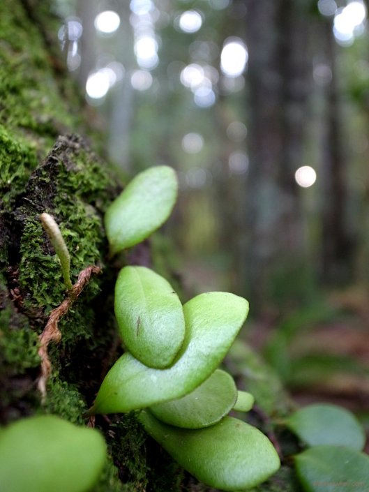 Being such a short walk I started scanning a little closer to the ground and trees, looking for something to get a shot of. Like the larger Smiths Bush, the trees were full of an array of epiphytes- mostly way up in the canopy, well out of detailed reach of the 28mm Ricoh. Across the trunks of several trees however sprung a collection of smaller leaved plants. I framed them up and caught today’s image.