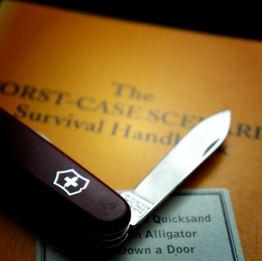 Missing the sun after work, and pulling my pocket knife out of my bag, looking for an image, I reflected on my practical side and composed today image.I really need to get some better portable lighting at home some time – I had to hold the knife and book up to the room light in one hand and take with the other. In post processing, I used Gimp to add a vignette and push up the saturation.