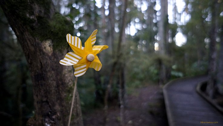 As I passed through the track I came across this small fan/windmill that someone had stuck into the side of a tree. The bright yellow stood out amongst the forest greens and browns as I leaned out from the walking track to line it up for the shot.