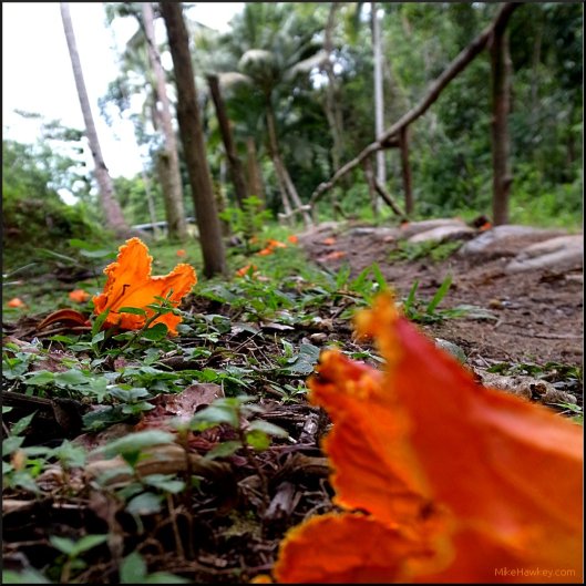 When out in the bush, in general, we get an amazing mix of forest colours – browns and greens essentially. These orange flowers that had fallen from the trees really stood out when we went through a trail in Fiji. When I captured the image, I was drawn to the trail of orange disappearing into the path ahead.