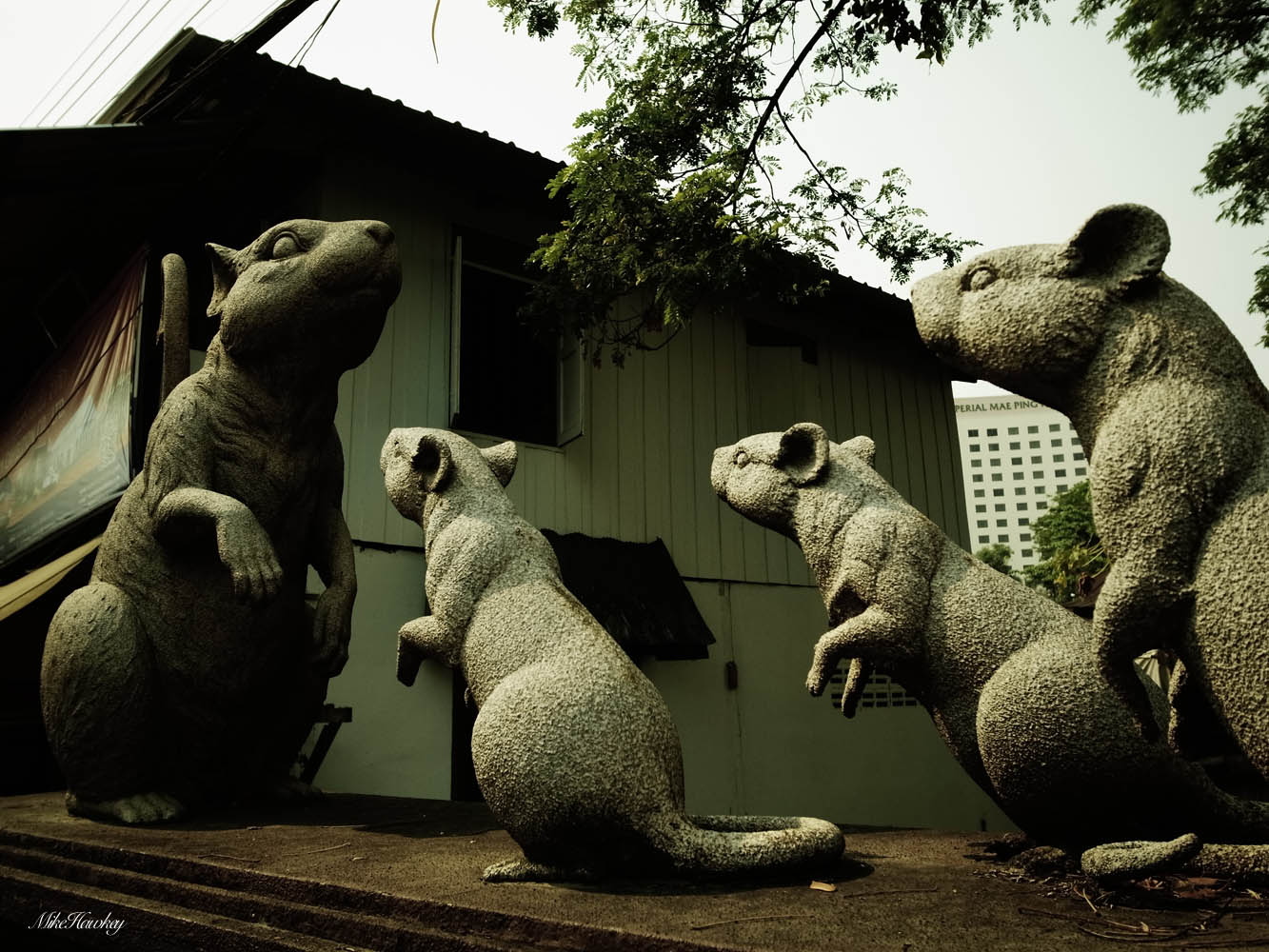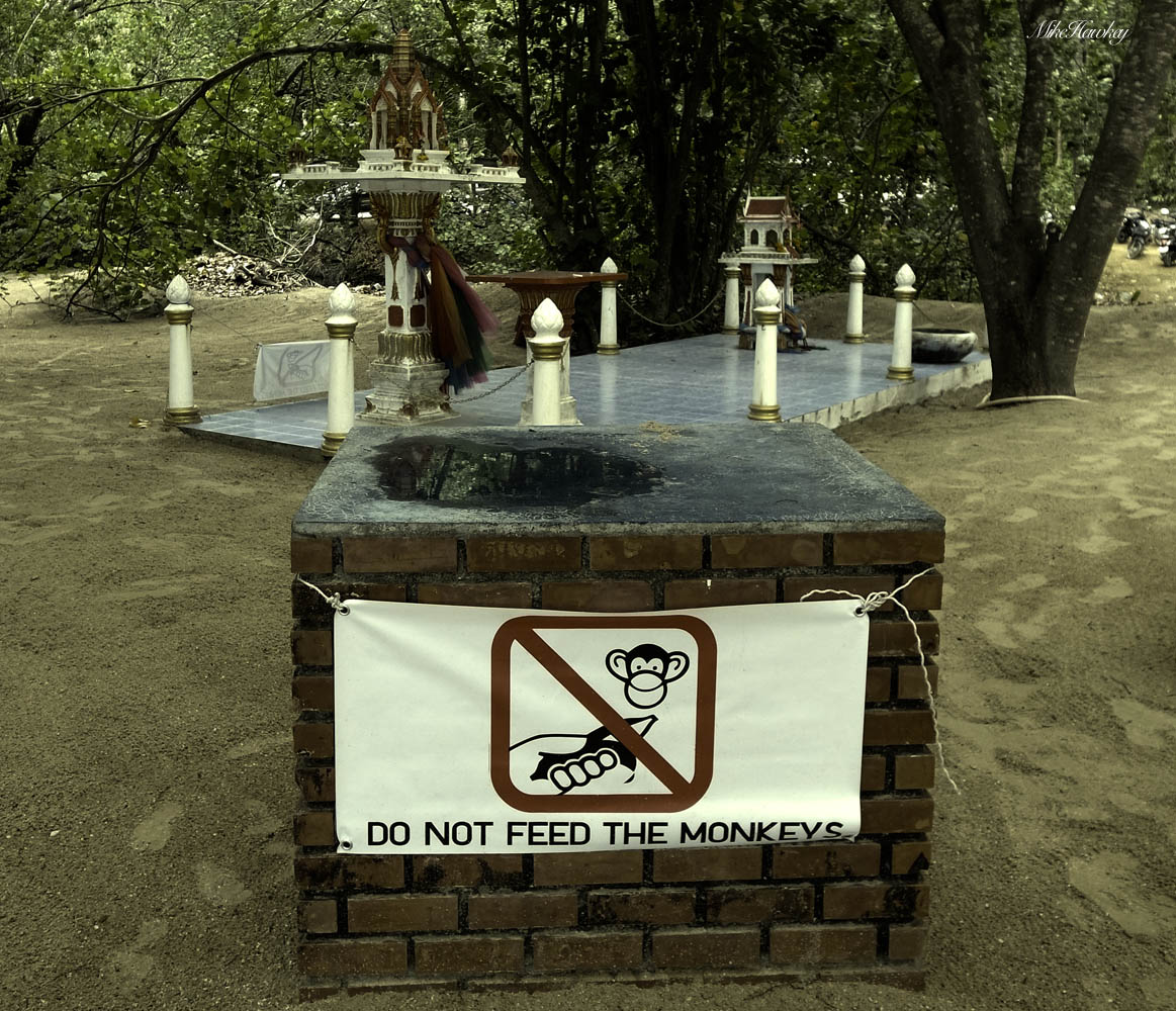Approaching the entryway we are welcomed by some ‘tree spirits’ reminding us that no whisky (drinking) is allowed within the temple grounds, and also no smoking. The whisky tree shows images of people with ugly distorted faces, acting like monsters (basically really drunk people), and the smoking one shows people with poor, early aged complexion. There is also the Predator. I don’t expect his type are welcomed either.