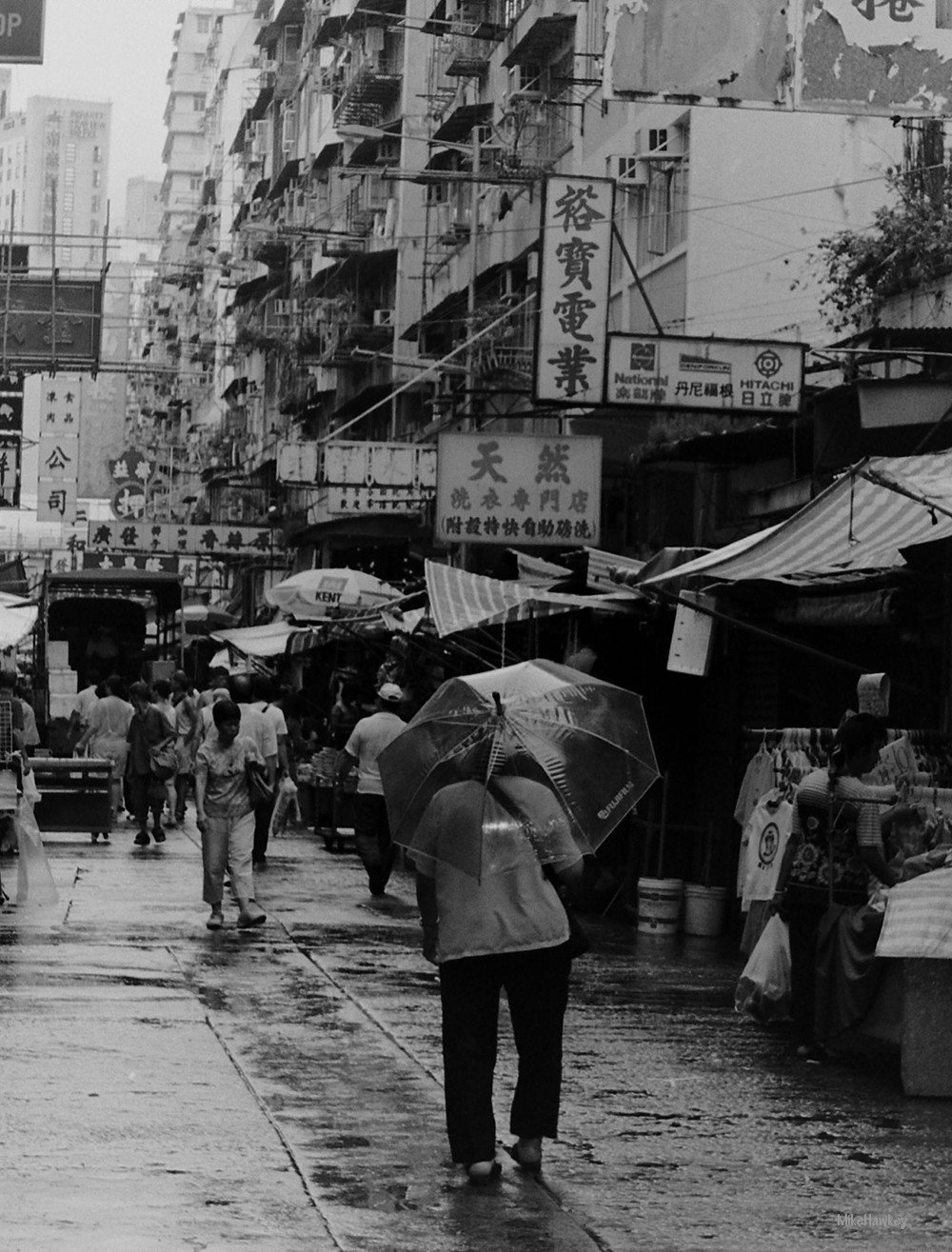 Shot back something like a decade now in Hong Kong on my Minolta Dynax, I captured this image from one of the local market streets. It had been raining, and I vaguely recall walking up behing the old lady with the brolly to frame her in the shot looking up the street.